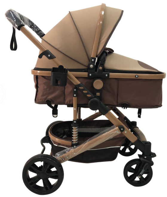 High-view iron tube stroller, seatable and reclinable, double-hand folding, reversible bassinet, 5-point safety belt, with foot cover, 27-inch + 210-inch foam tires, front wheels lockable, rear wheels one-step dual brakes