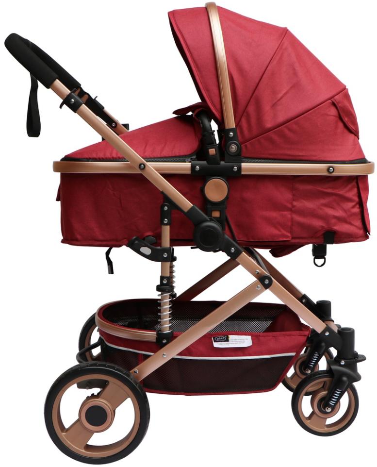High-view iron tube stroller, seatable and reclinable, double-hand folding, reversible bassinet, 5-point safety belt, with foot cover, 27-inch + 210-inch foam tires, front wheels lockable, rear wheels one-step dual brakes