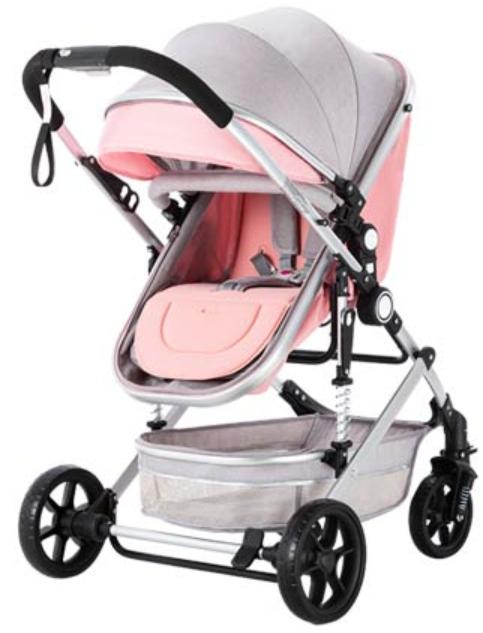 High-view iron tube stroller, seatable and reclinable, single-hand folding, reversible bassinet, 5-point safety belt, with foot cover, 27-inch + 210-inch foam tires, front wheels lockable, rear wheels one-step dual brakes