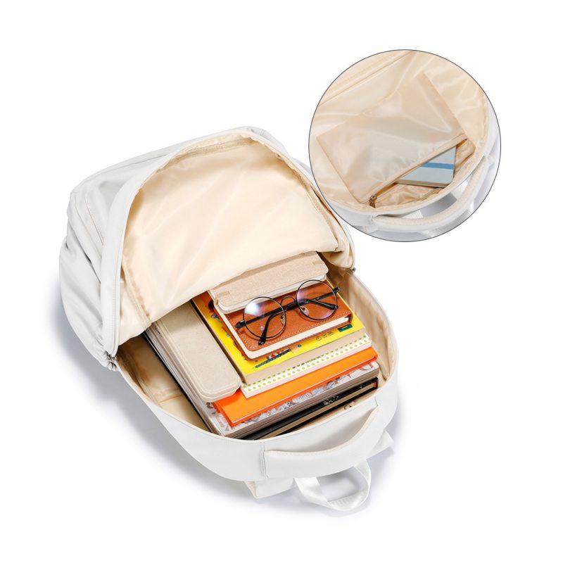This backpack features a contrast-color design, available in color combinations (white-pink, brown-white, gray-white, black-white, etc.). It measures 45.5×32×20.5 cm, with ample internal space to hold books, electronic devices, etc., and is equipped with internal compartments for classified storage; the shoulder straps are made of breathable mesh material for comfortable carrying; the side elastic pockets make it suitable for daily commuting, studying, short trips and other scenarios, combining practicality and a minimalist appearance.