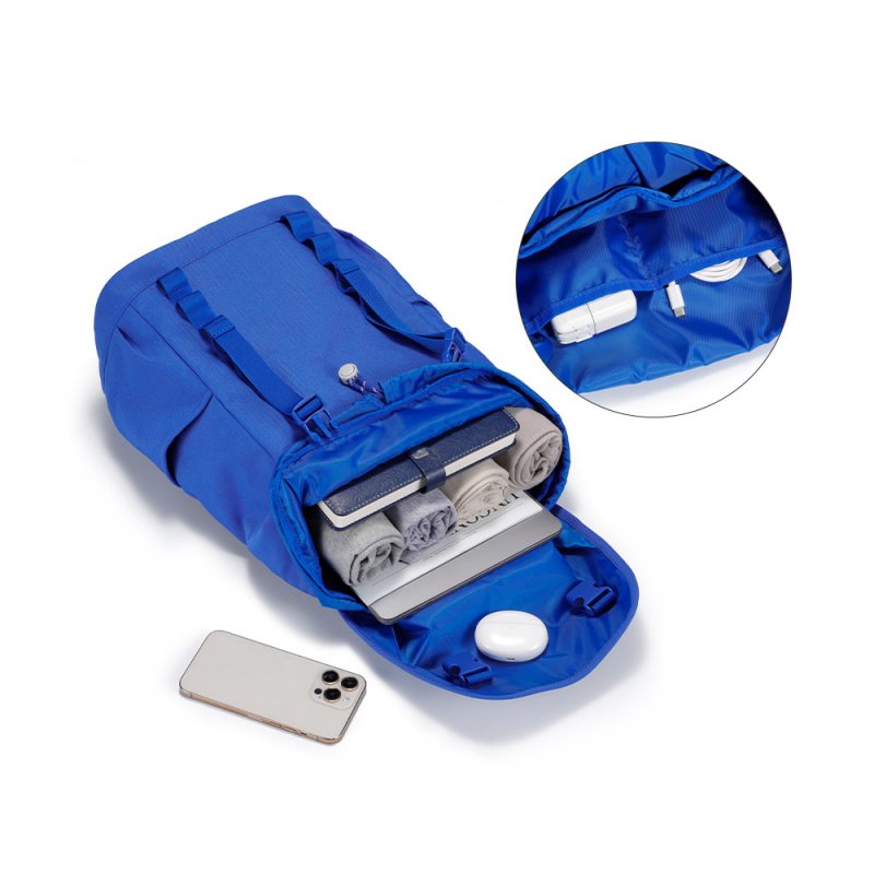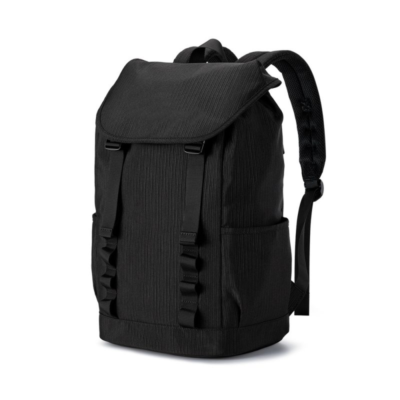 This backpack is made of textured fabric with a simple and elegant appearance, available in multiple colors (including blue, gray, black, yellow, etc.). It measures 45.5×28×16.5 cm, with sufficient internal space to hold laptops, daily necessities, etc. It also has an independent small compartment for storing small items like data cables and earphones; external side pockets are designed for easy placement of personal belongings. The shoulder straps are breathable for comfortable carrying, and the flip cover + buckle closure combines practicality and design sense, making it suitable for daily commuting, studying and other scenarios.