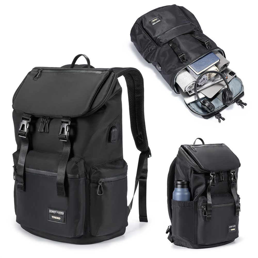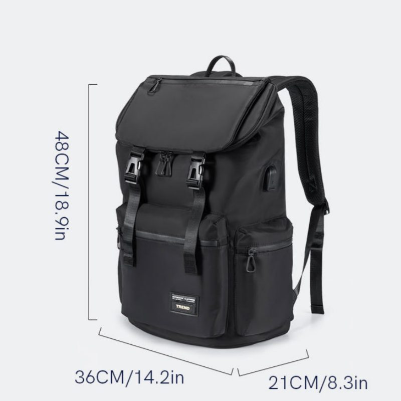 This backpack, marked with TREND, features a functional style and is available in multiple colors (black, gray, khaki, etc.). It measures 48×36×21 cm, with ample internal space to hold laptops and daily necessities; externally, it is equipped with multiple pockets (main pocket, front pocket, side pockets) for classified storage; the shoulder straps are designed with breathable padding for comfortable carrying; the flip cover + buckle closure combines practicality and design, suitable for commuting, outdoor and other scenarios.
