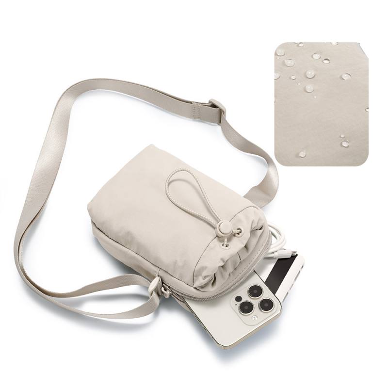 This crossbody bag is made of waterproof fabric, available in multiple colors (beige, red, green, blue, black, etc.). It features a lightweight and compact design, paired with drawstring + zipper double closure, and can hold mobile phones, cards, small items and other personal belongings inside; the adjustable long shoulder strap is suitable for crossbody, single-shoulder carrying styles, and fits light scenarios such as daily travel and shopping, combining portability and practicality.